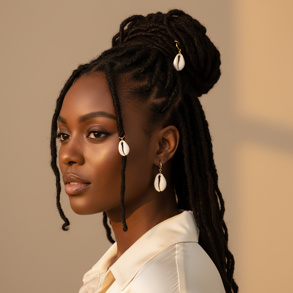 Each natural cowrie shell is hand-selected with the highest standards of ethical sourcing, attached to a hoop made of 18-karat gold, filled over a sterling silver base. This charm secures through your locs, braids, or twists, and offers a captivating blend of elegance and legacy.